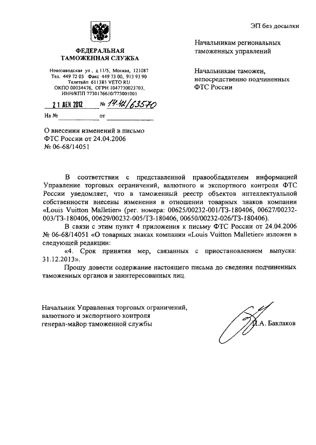 ПИСЬМО ФТС РФ от 21.12.2012 N 14-42/63570