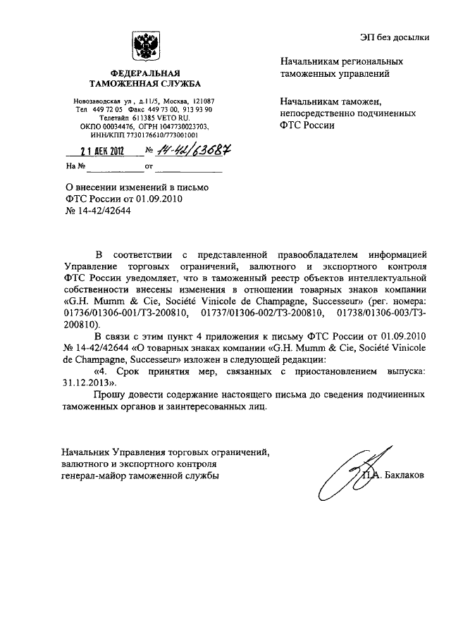 ПИСЬМО ФТС РФ от 21.12.2012 N 14-42/63687