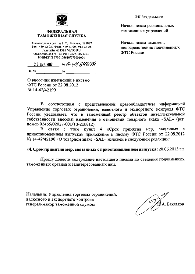 "О ВНЕСЕНИИ ИЗМЕНЕНИЙ В ПИСЬМО ФТС РОССИИ ОТ 22.08.2012 N 14-42/42190"