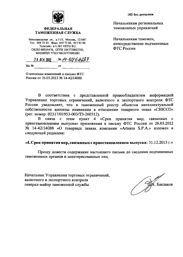 ПИСЬМО ФТС РФ от 26.12.2012 N 14-42/64287