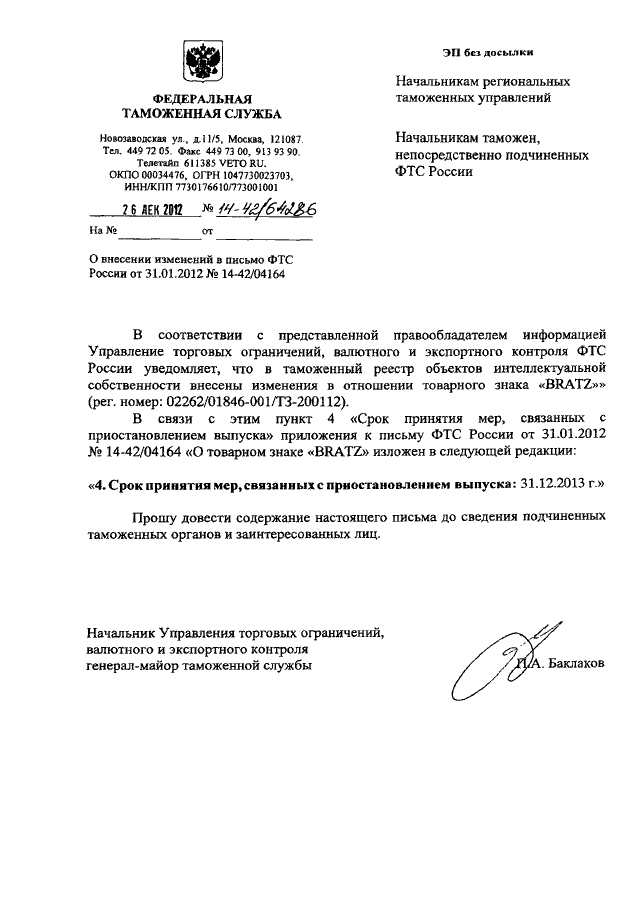 ПИСЬМО ФТС РФ от 26.12.2012 N 14-42/64286