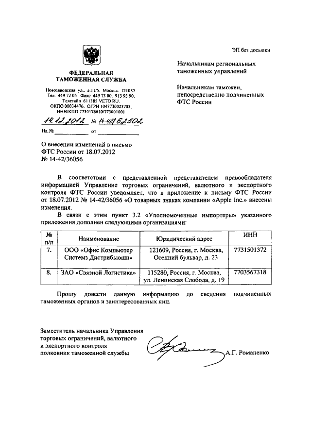 "О ВНЕСЕНИИ ИЗМЕНЕНИЙ В ПИСЬМО ФТС РОССИИ ОТ 18.07.2012 N 14-42/36056"