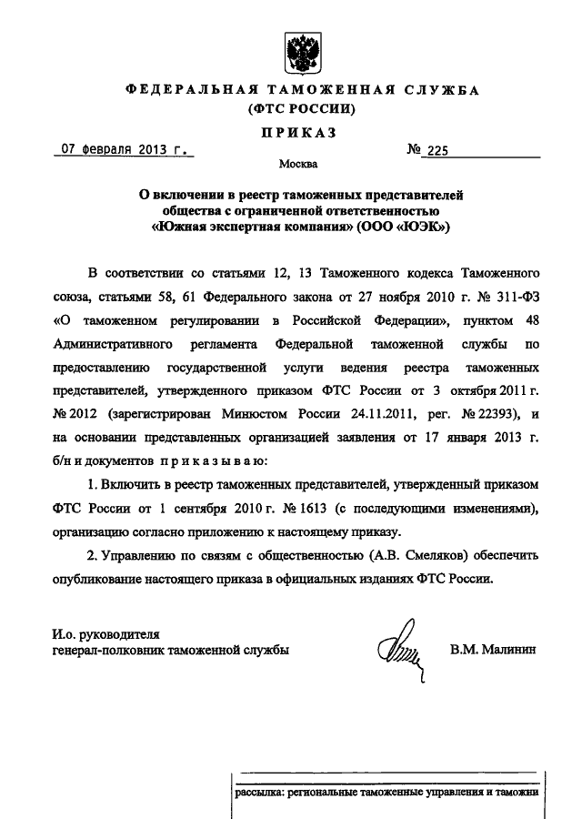 ПРИКАЗ ФТС РФ от 07.02.2013 N 225