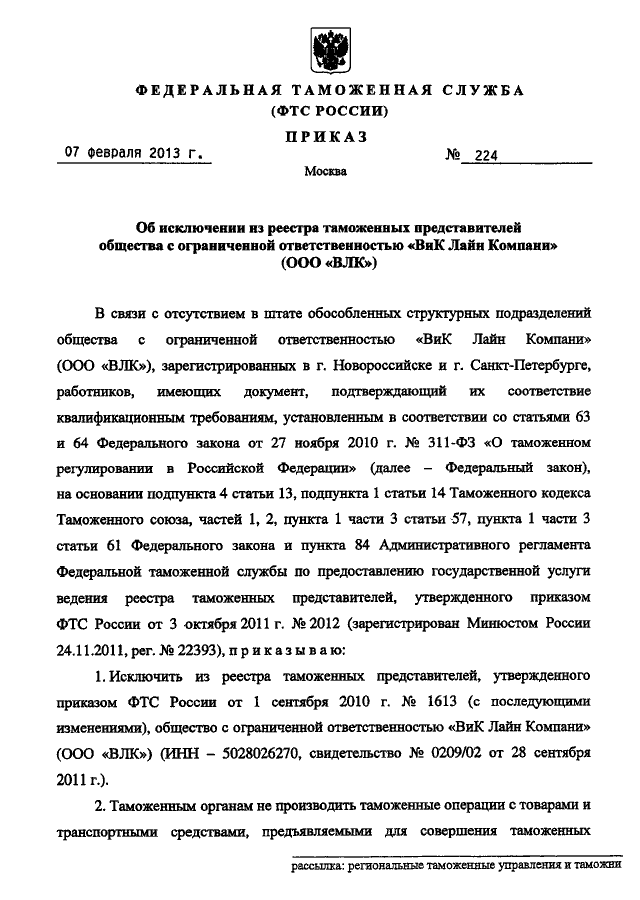 ПРИКАЗ ФТС РФ от 07.02.2013 N 224