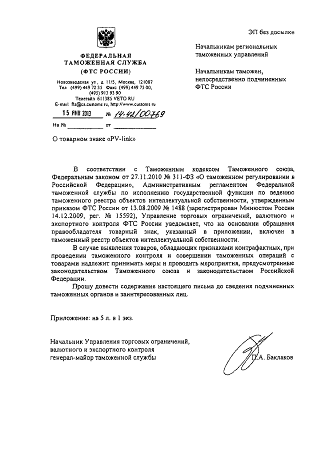 ПИСЬМО ФТС РФ от 15.01.2013 N 14-42/00769