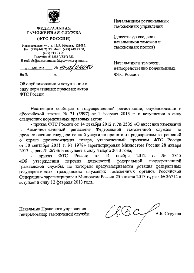 ПИСЬМО ФТС РФ от 01.02.2013 N 15-12/04040