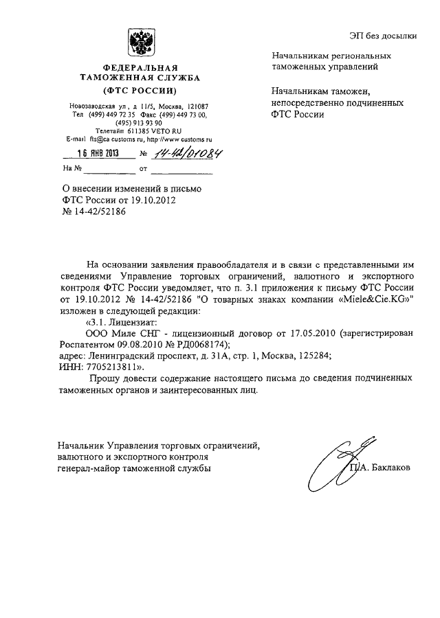 "О ВНЕСЕНИИ ИЗМЕНЕНИЙ В ПИСЬМО ФТС РОССИИ ОТ 19.10.2012 N 14-42/52186"