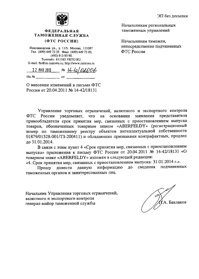 ПИСЬМО ФТС РФ от 22.01.2013 N 14-42/02006