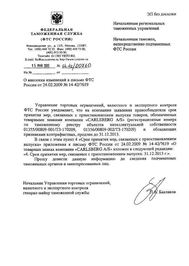 ПИСЬМО ФТС РФ от 15.01.2013 N 14-42/00760