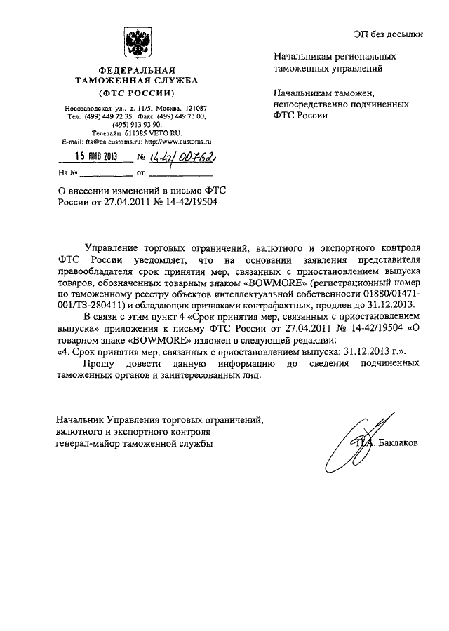 ПИСЬМО ФТС РФ от 15.01.2013 N 14-42/00762