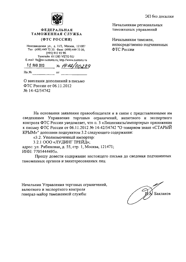 ПИСЬМО ФТС РФ от 11.01.2013 N 14-42/00289
