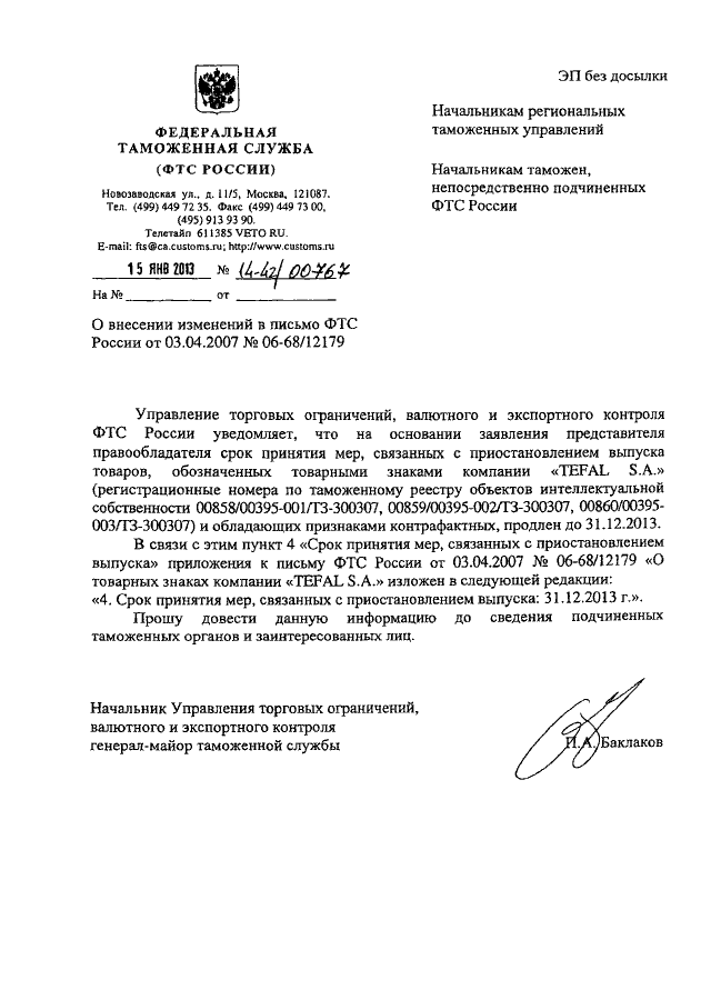 ПИСЬМО ФТС РФ от 15.01.2013 N 14-42/00767