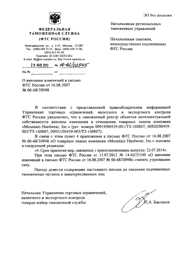 "О ВНЕСЕНИИ ИЗМЕНЕНИЙ В ПИСЬМО ФТС РОССИИ ОТ 16.08.2007 N 06-68/30948"