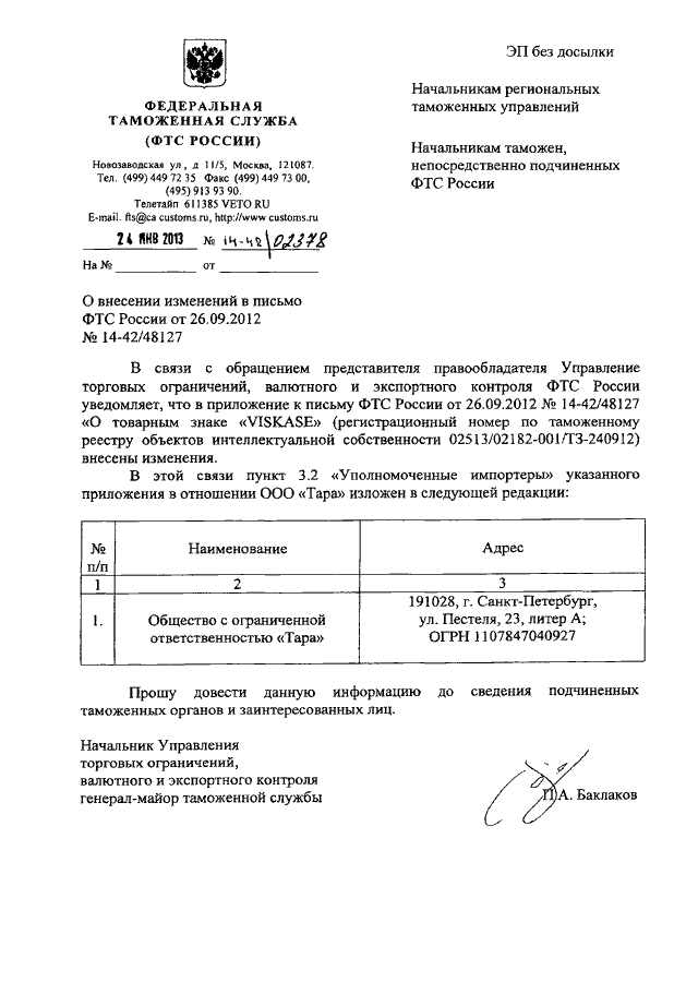 "О ВНЕСЕНИИ ИЗМЕНЕНИЙ В ПИСЬМО ФТС РОССИИ ОТ 26.09.2012 N 14-42/48127"