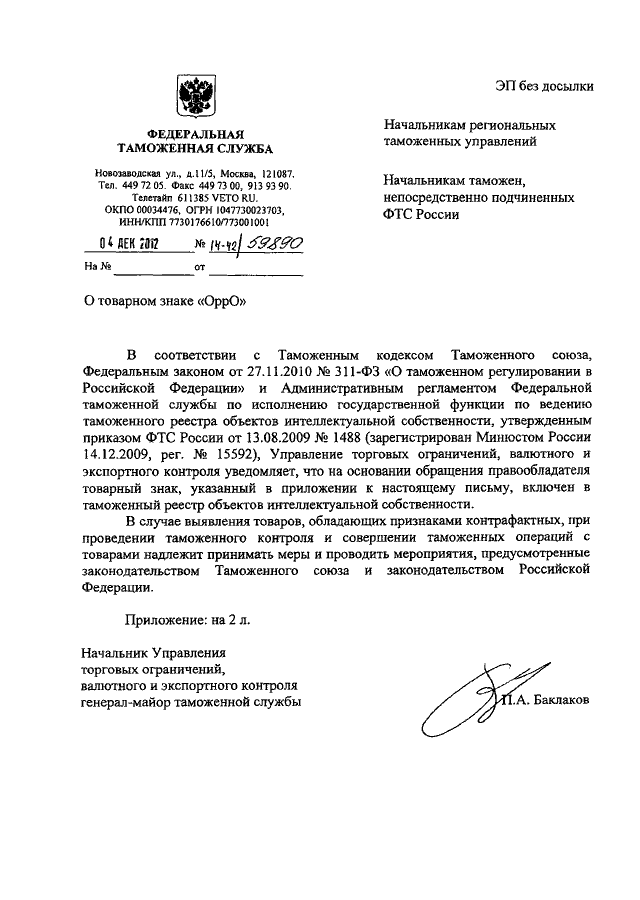 ПИСЬМО ФТС РФ от 04.12.2012 N 14-42/59890