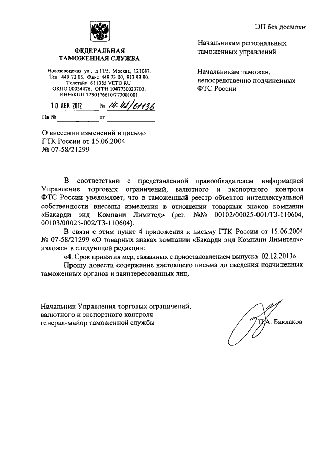 ПИСЬМО ФТС РФ от 10.12.2012 N 14-42/61136
