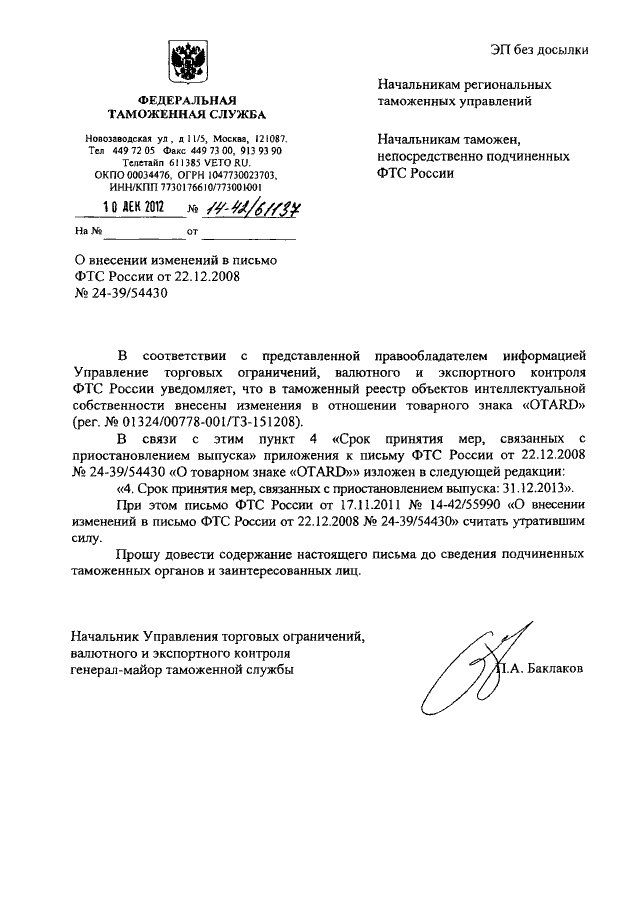 ПИСЬМО ФТС РФ от 10.12.2012 N 14-42/61137