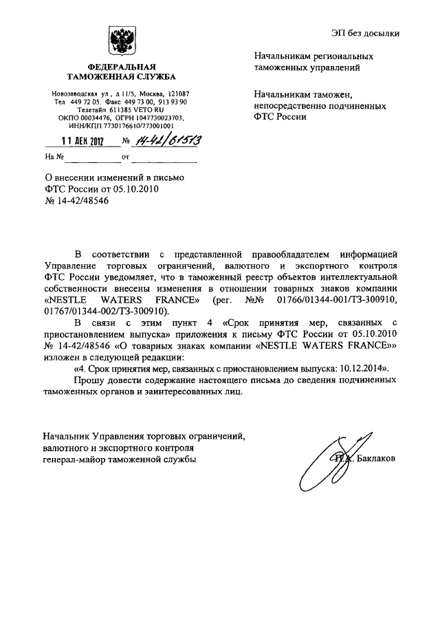 "О ВНЕСЕНИИ ИЗМЕНЕНИЙ В ПИСЬМО ФТС РОССИИ ОТ 05.10.2010 N 14-42/48546"