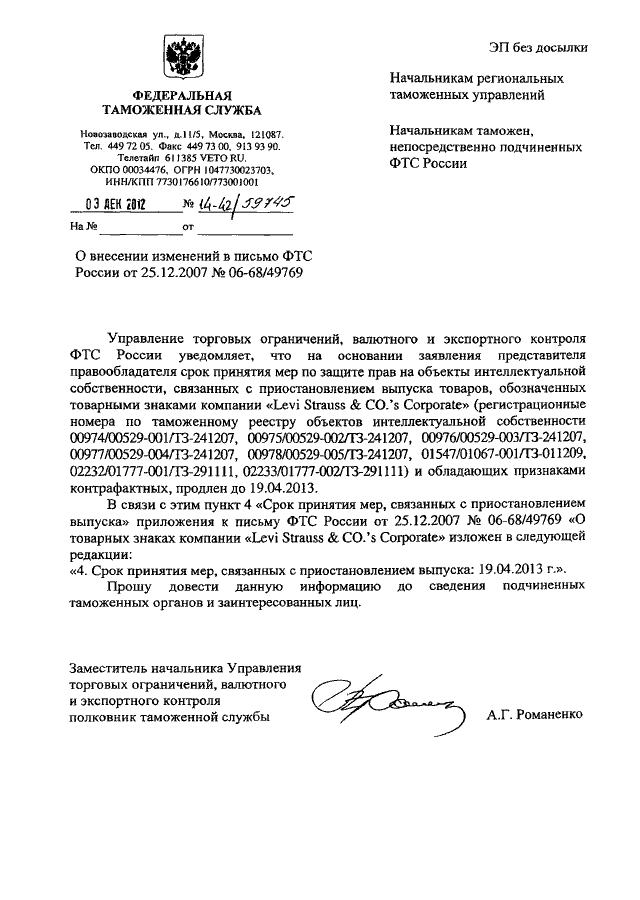 ПИСЬМО ФТС РФ от 03.12.2012 N 14-42/59745