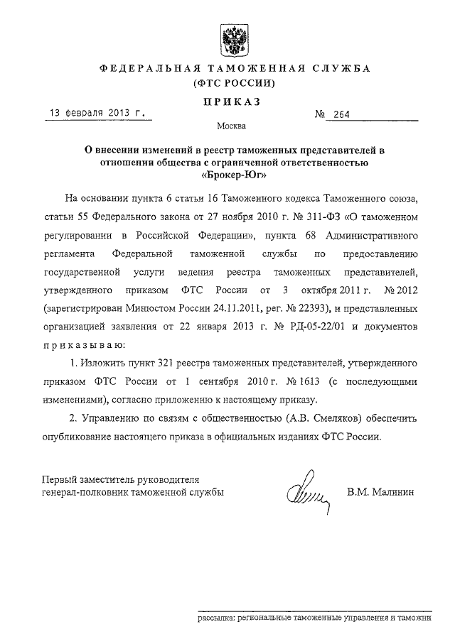ПРИКАЗ ФТС РФ от 13.02.2013 N 264