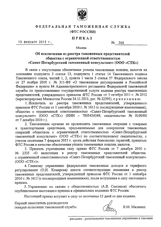 ПРИКАЗ ФТС РФ от 13.02.2013 N 266