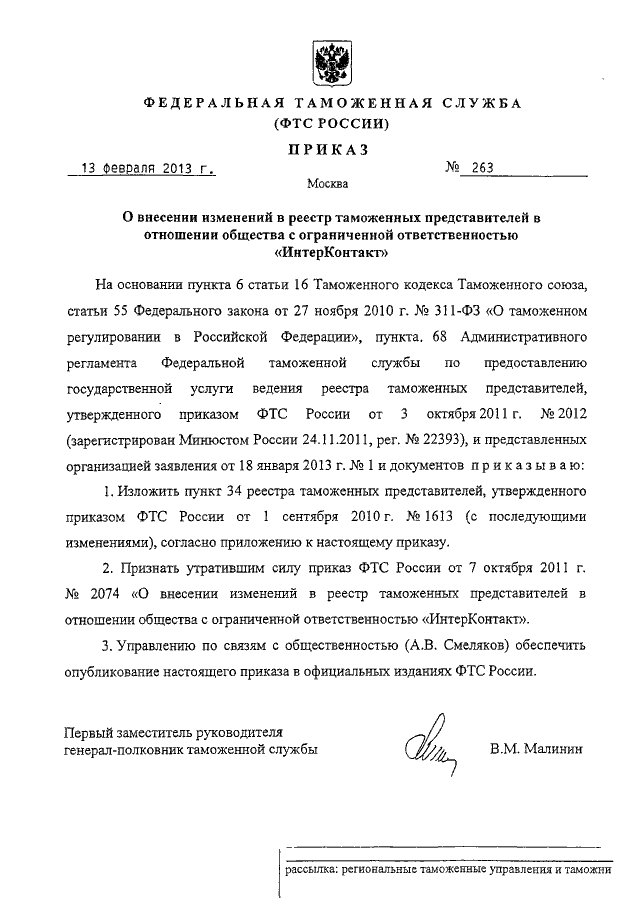 ПРИКАЗ ФТС РФ от 13.02.2013 N 263