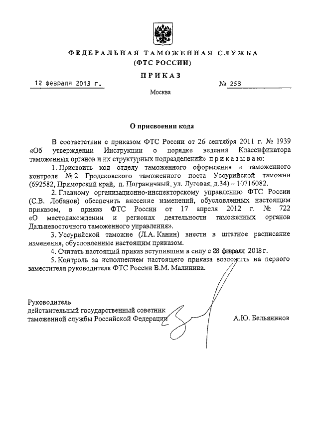 ПРИКАЗ ФТС РФ от 12.02.2013 N 253