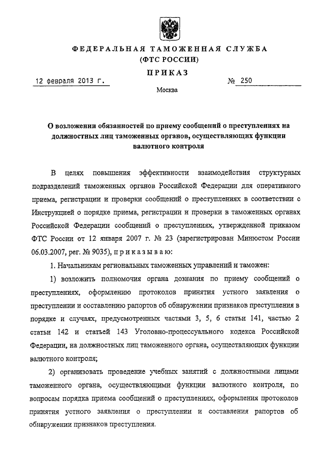 ПРИКАЗ ФТС РФ от 12.02.2013 N 250