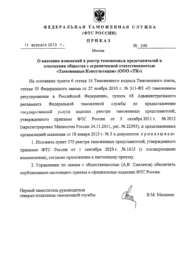ПРИКАЗ ФТС РФ от 11.02.2013 N 246