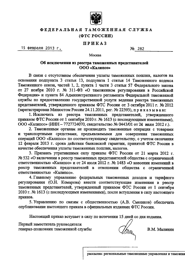 ПРИКАЗ ФТС РФ от 15.02.2013 N 282