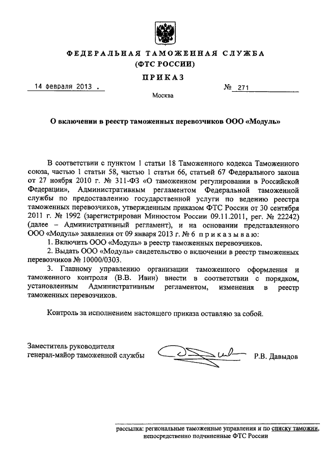 "О ВКЛЮЧЕНИИ В РЕЕСТР ТАМОЖЕННЫХ ПЕРЕВОЗЧИКОВ ООО "МОДУЛЬ"