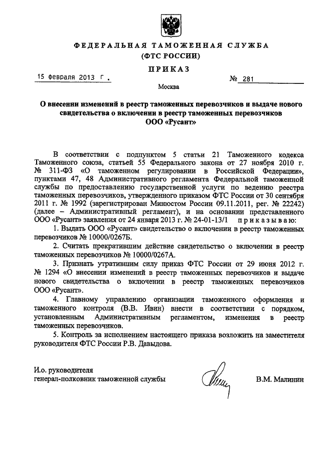 "О ВНЕСЕНИИ ИЗМЕНЕНИЙ В РЕЕСТР ТАМОЖЕННЫХ ПЕРЕВОЗЧИКОВ И ВЫДАЧЕ НОВОГО СВИДЕТЕЛЬСТВА О ВКЛЮЧЕНИИ В РЕЕСТР ТАМОЖЕННЫХ ПЕРЕВОЗЧИКОВ ООО "РУСАНТ"