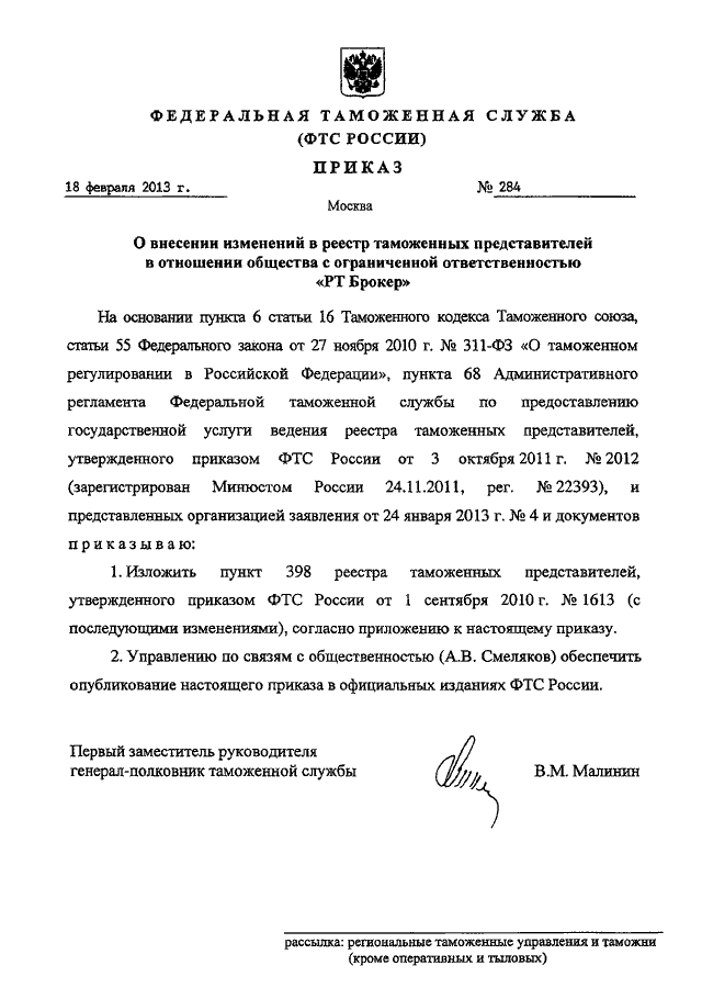 ПРИКАЗ ФТС РФ от 18.02.2013 N 284