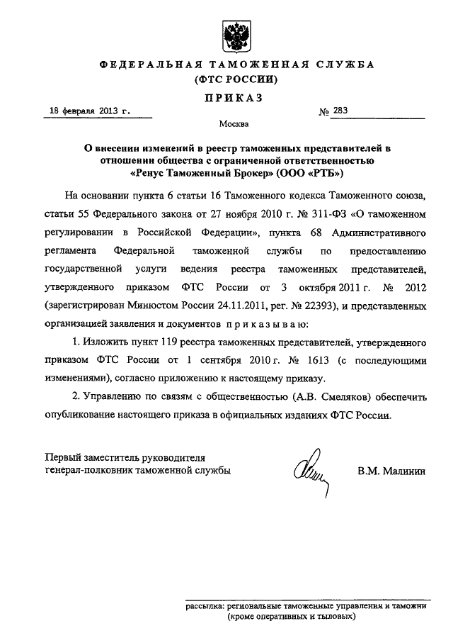 ПРИКАЗ ФТС РФ от 18.02.2013 N 283