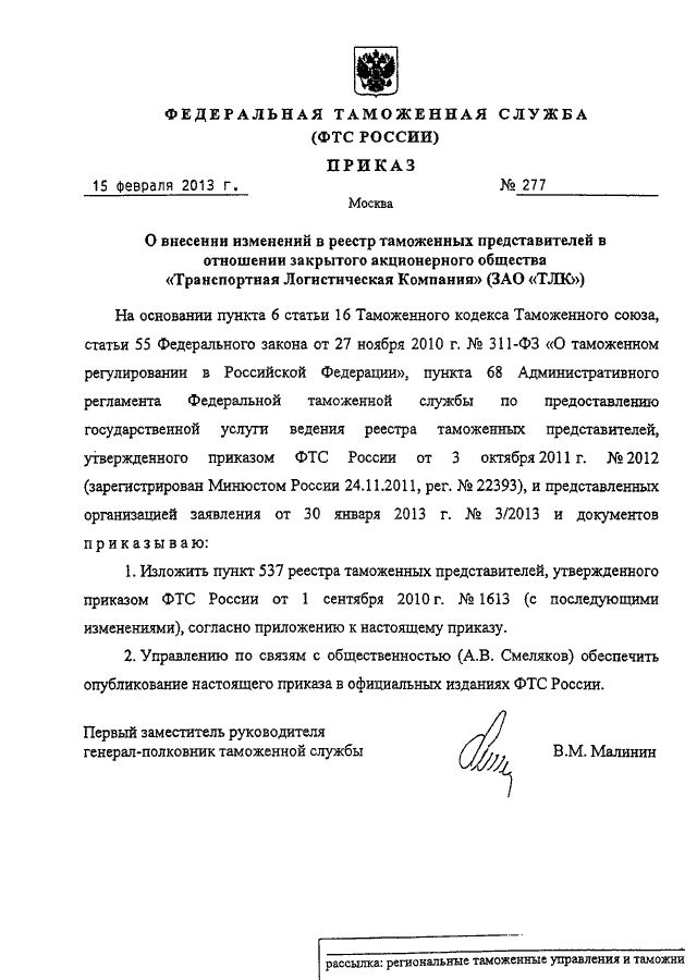 ПРИКАЗ ФТС РФ от 15.02.2013 N 277