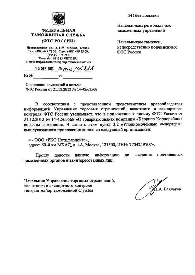 "О ВНЕСЕНИИ ИЗМЕНЕНИЙ В ПИСЬМО ФТС РОССИИ ОТ 21.12.2012 N 14-42/63568"