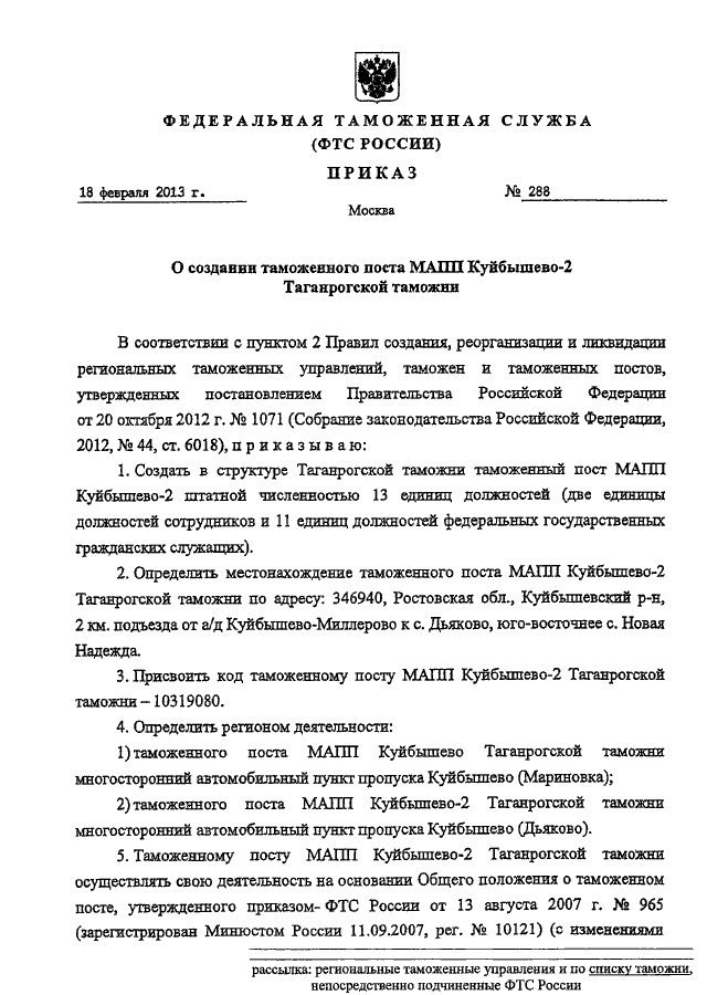 "О СОЗДАНИИ ТАМОЖЕННОГО ПОСТА МАПП КУЙБЫШЕВО-2 ТАГАНРОГСКОЙ ТАМОЖНИ"