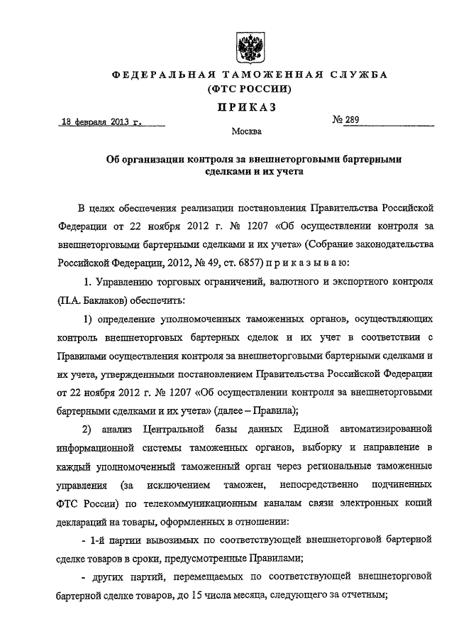 ПРИКАЗ ФТС РФ от 18.02.2013 N 289