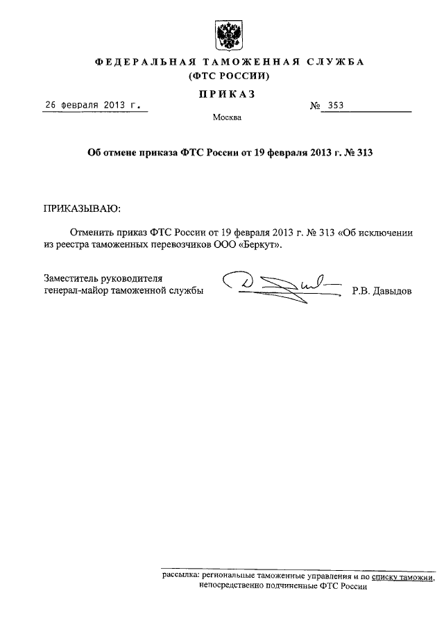 "ОБ ОТМЕНЕ ПРИКАЗА ФТС РОССИИ ОТ 19 ФЕВРАЛЯ 2013 Г. N 313"
