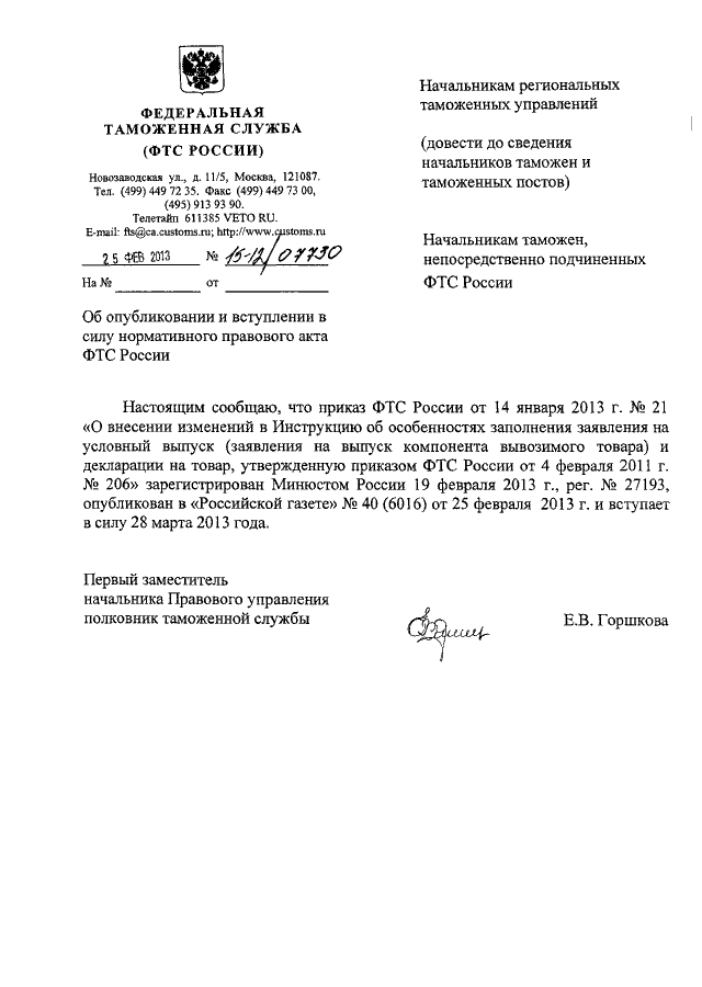 ПИСЬМО ФТС РФ от 25.02.2013 N 15-12/07730
