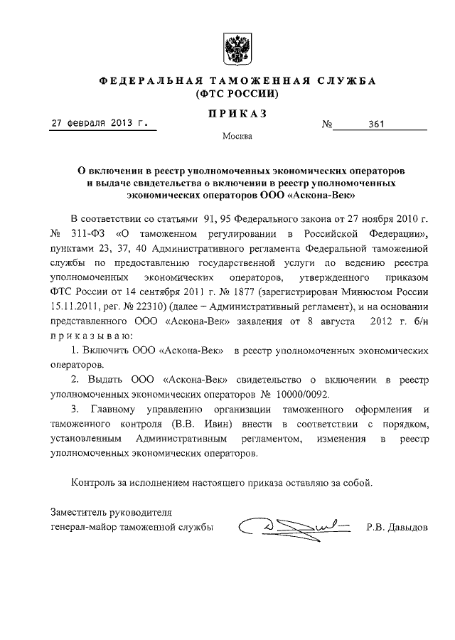"О ВКЛЮЧЕНИИ В РЕЕСТР УПОЛНОМОЧЕННЫХ ЭКОНОМИЧЕСКИХ ОПЕРАТОРОВ И ВЫДАЧЕ СВИДЕТЕЛЬСТВА О ВКЛЮЧЕНИИ В РЕЕСТР УПОЛНОМОЧЕННЫХ ЭКОНОМИЧЕСКИХ ОПЕРАТОРОВ ООО "АСКОНА-ВЕК"