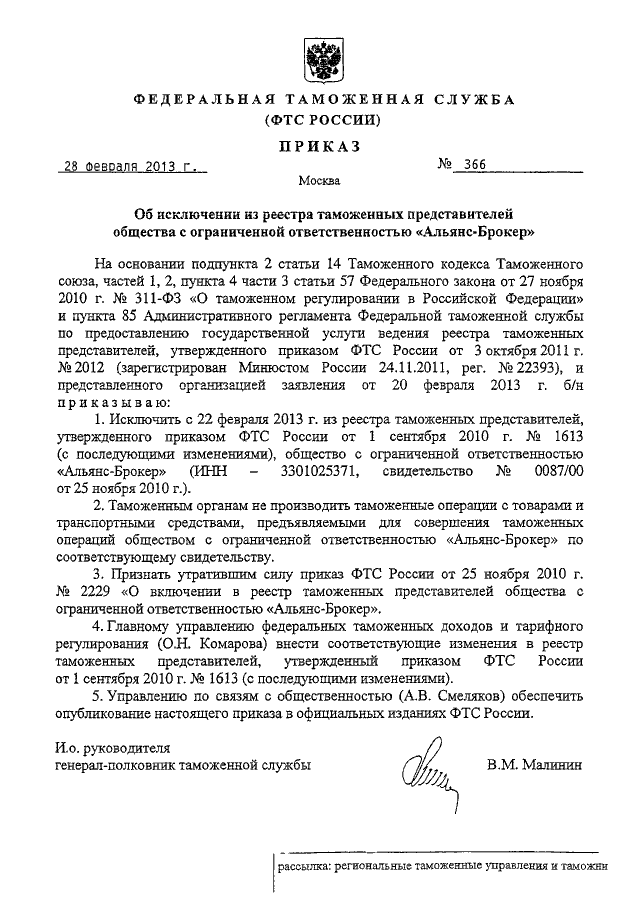 "ОБ ИСКЛЮЧЕНИИ ИЗ РЕЕСТРА ТАМОЖЕННЫХ ПРЕДСТАВИТЕЛЕЙ ОБЩЕСТВА С ОГРАНИЧЕННОЙ ОТВЕТСТВЕННОСТЬЮ "АЛЬЯНС-БРОКЕР"