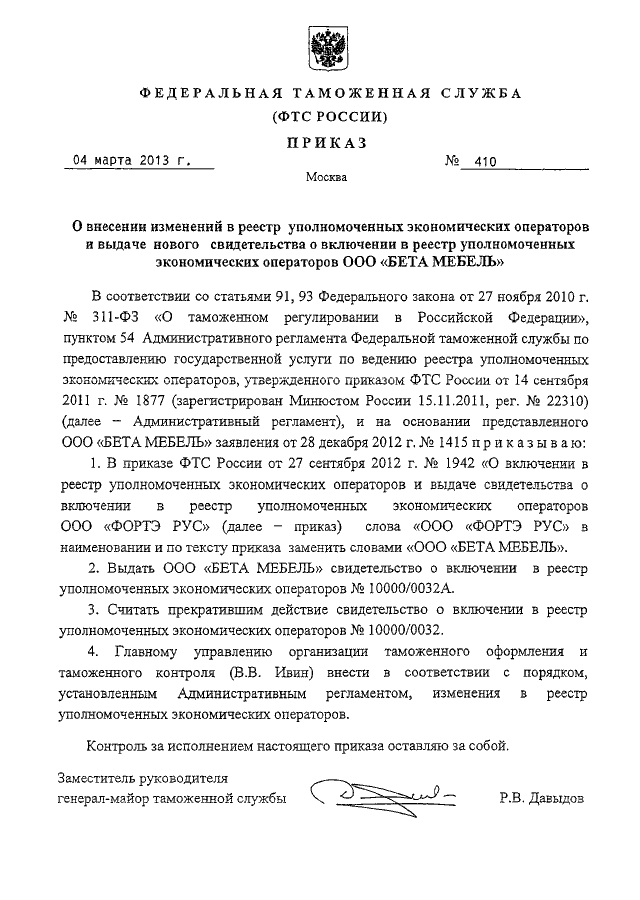 "О ВНЕСЕНИИ ИЗМЕНЕНИЙ В РЕЕСТР УПОЛНОМОЧЕННЫХ ЭКОНОМИЧЕСКИХ ОПЕРАТОРОВ И ВЫДАЧЕ НОВОГО СВИДЕТЕЛЬСТВА О ВКЛЮЧЕНИИ В РЕЕСТР УПОЛНОМОЧЕННЫХ ЭКОНОМИЧЕСКИХ ОПЕРАТОРОВ ООО "БЕТА МЕБЕЛЬ"