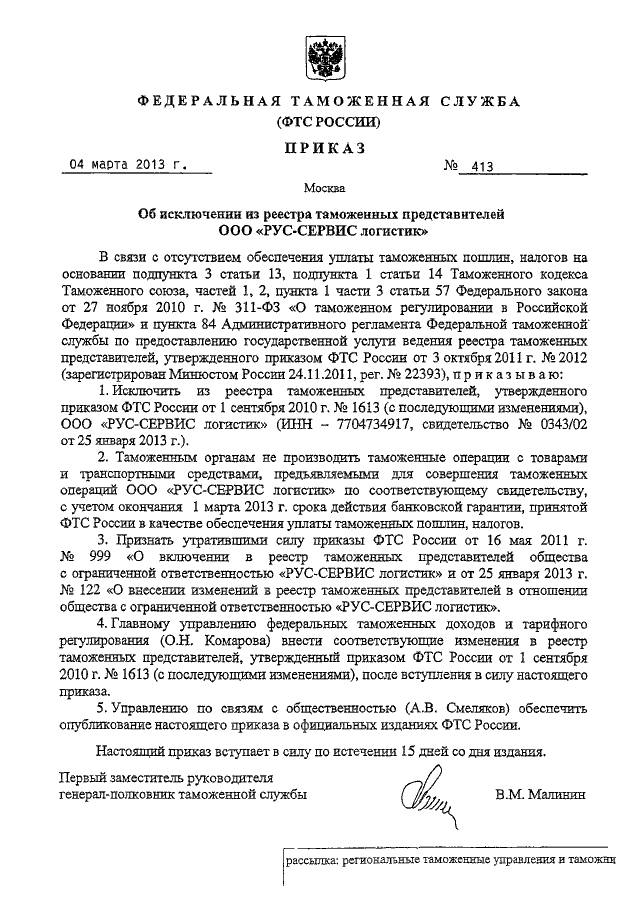ПРИКАЗ ФТС РФ от 04.03.2013 N 413