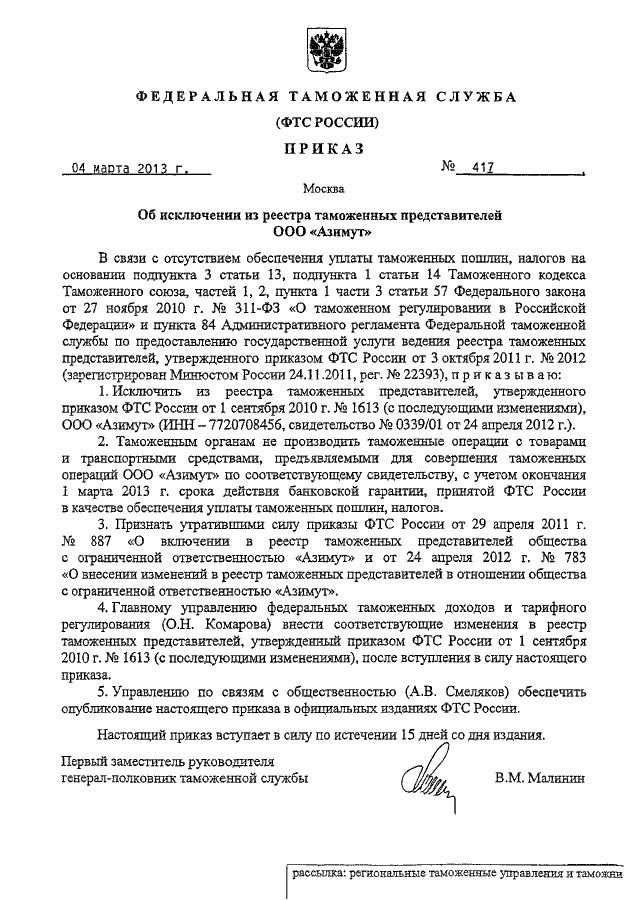 ПРИКАЗ ФТС РФ от 04.03.2013 N 417