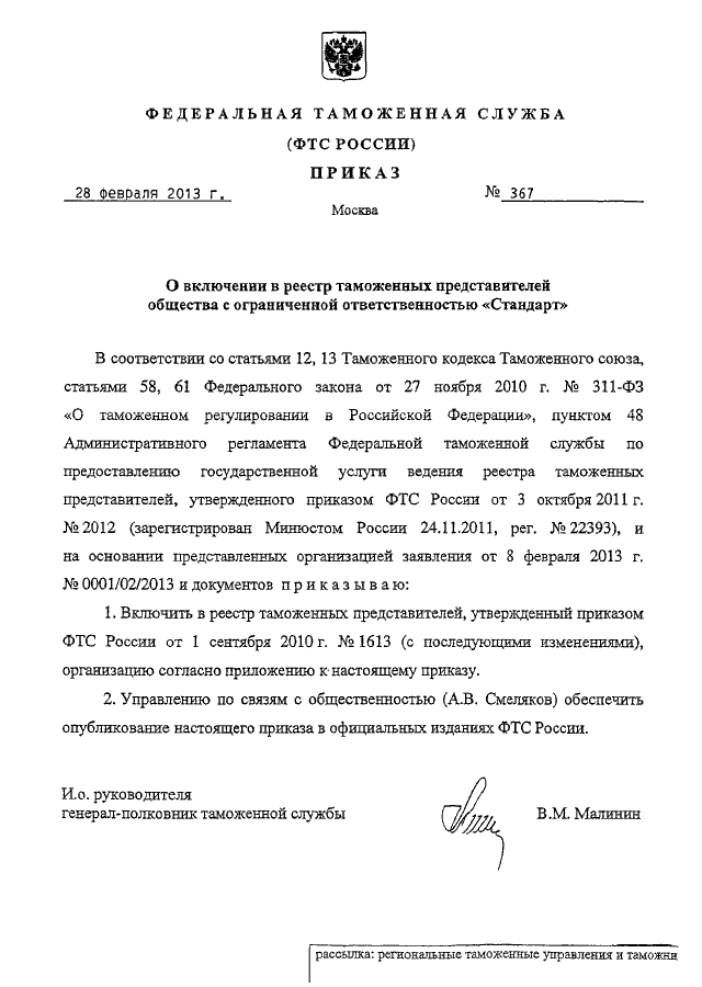 ПРИКАЗ ФТС РФ от 28.02.2013 N 367