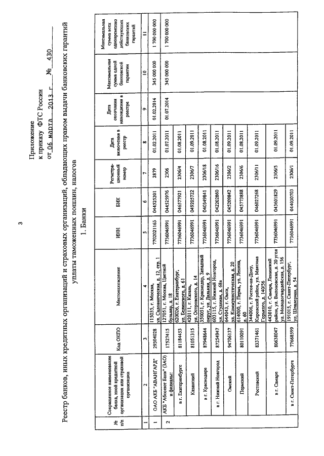 "ОБ УТВЕРЖДЕНИИ РЕЕСТРА БАНКОВ, ИНЫХ КРЕДИТНЫХ ОРГАНИЗАЦИЙ И СТРАХОВЫХ ОРГАНИЗАЦИЙ, ОБЛАДАЮЩИХ ПРАВОМ ВЫДАЧИ БАНКОВСКИХ ГАРАНТИЙ УПЛАТЫ ТАМОЖЕННЫХ ПОШЛИН, НАЛОГОВ"