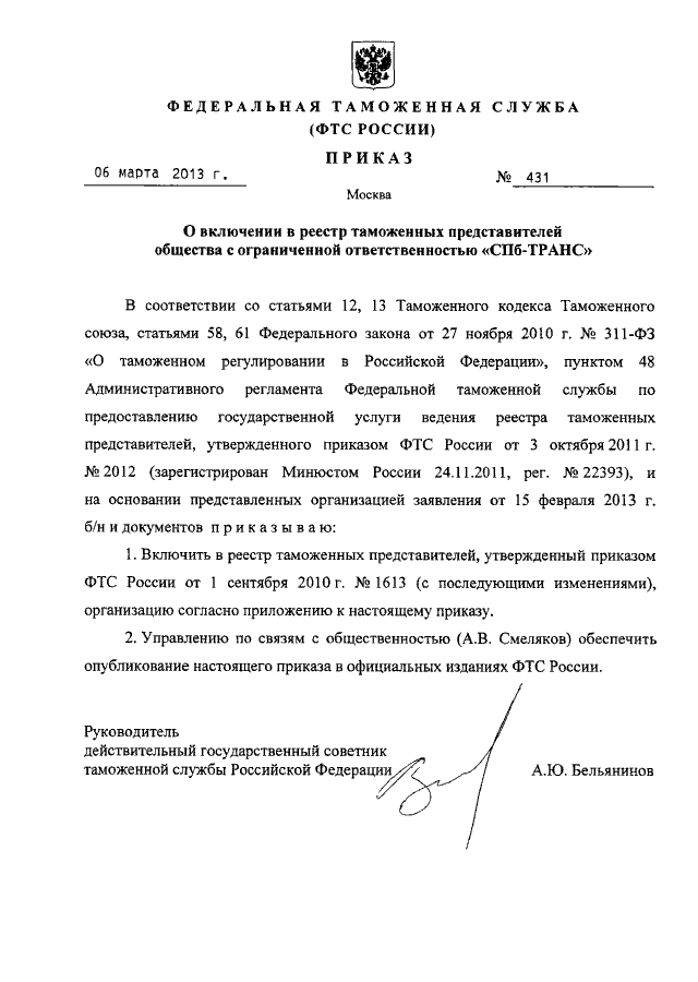 ПРИКАЗ ФТС РФ от 06.03.2013 N 431