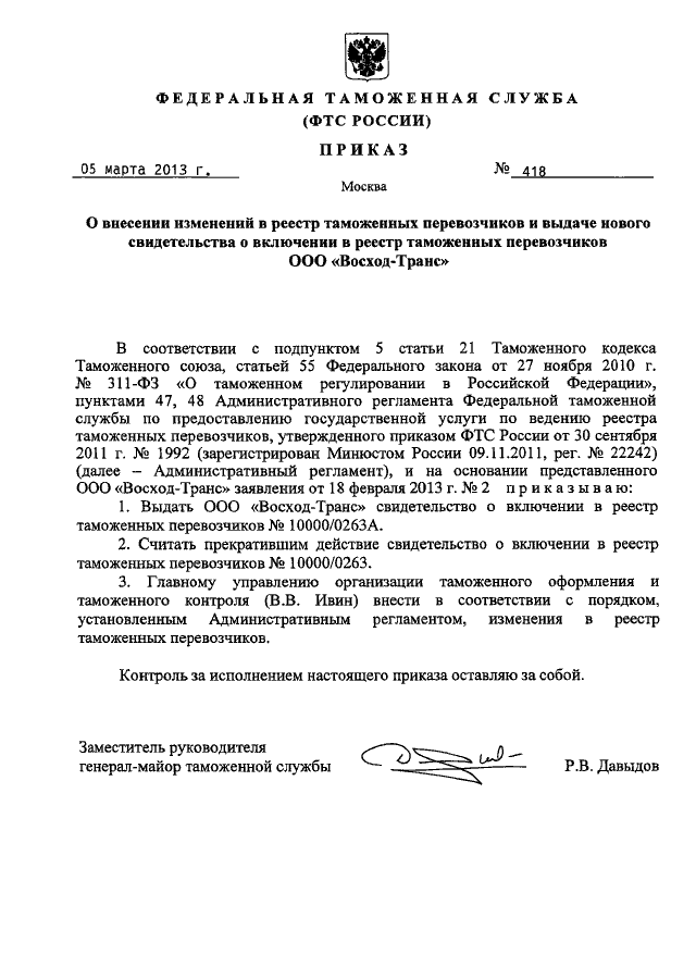 "О ВНЕСЕНИИ ИЗМЕНЕНИЙ В РЕЕСТР ТАМОЖЕННЫХ ПЕРЕВОЗЧИКОВ И ВЫДАЧЕ НОВОГО СВИДЕТЕЛЬСТВА О ВКЛЮЧЕНИИ В РЕЕСТР ТАМОЖЕННЫХ ПЕРЕВОЗЧИКОВ ООО "ВОСХОД-ТРАНС"