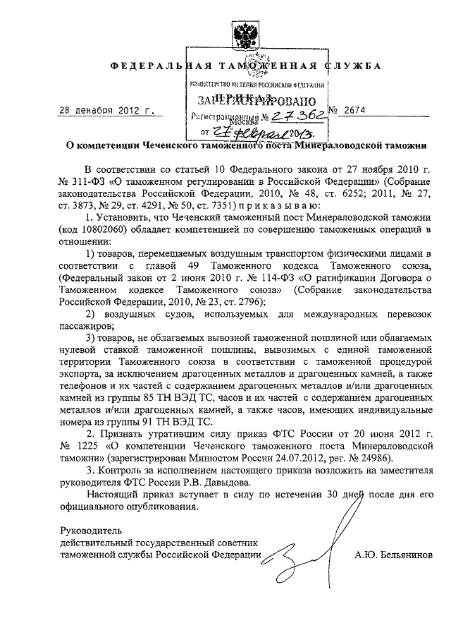 ПРИКАЗ ФТС РФ от 28.12.2012 N 2674